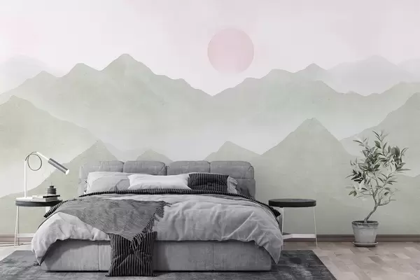 Carta da parati Paesaggio montano in stile boho, tramonto, pastello morbido, verde nr. w03547