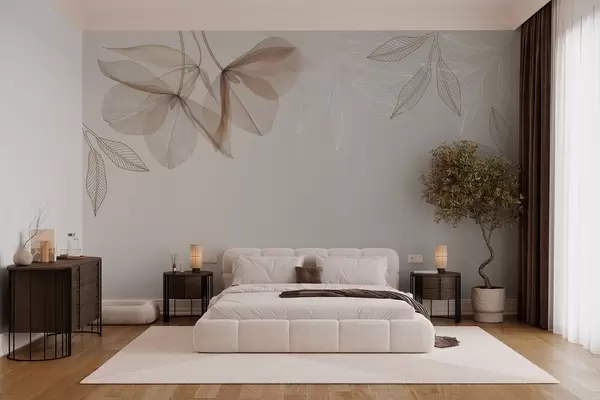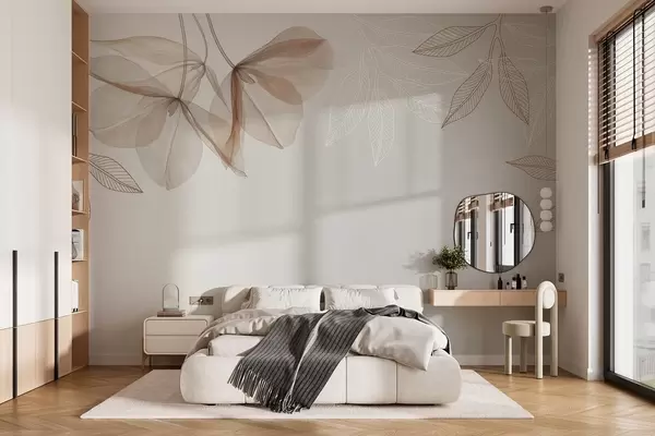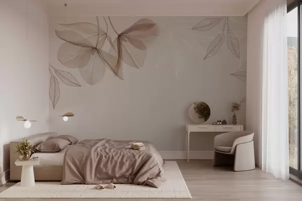 Carta da parati delicati fiori e foglie traslucidi nei toni del moka nr. w03616v3