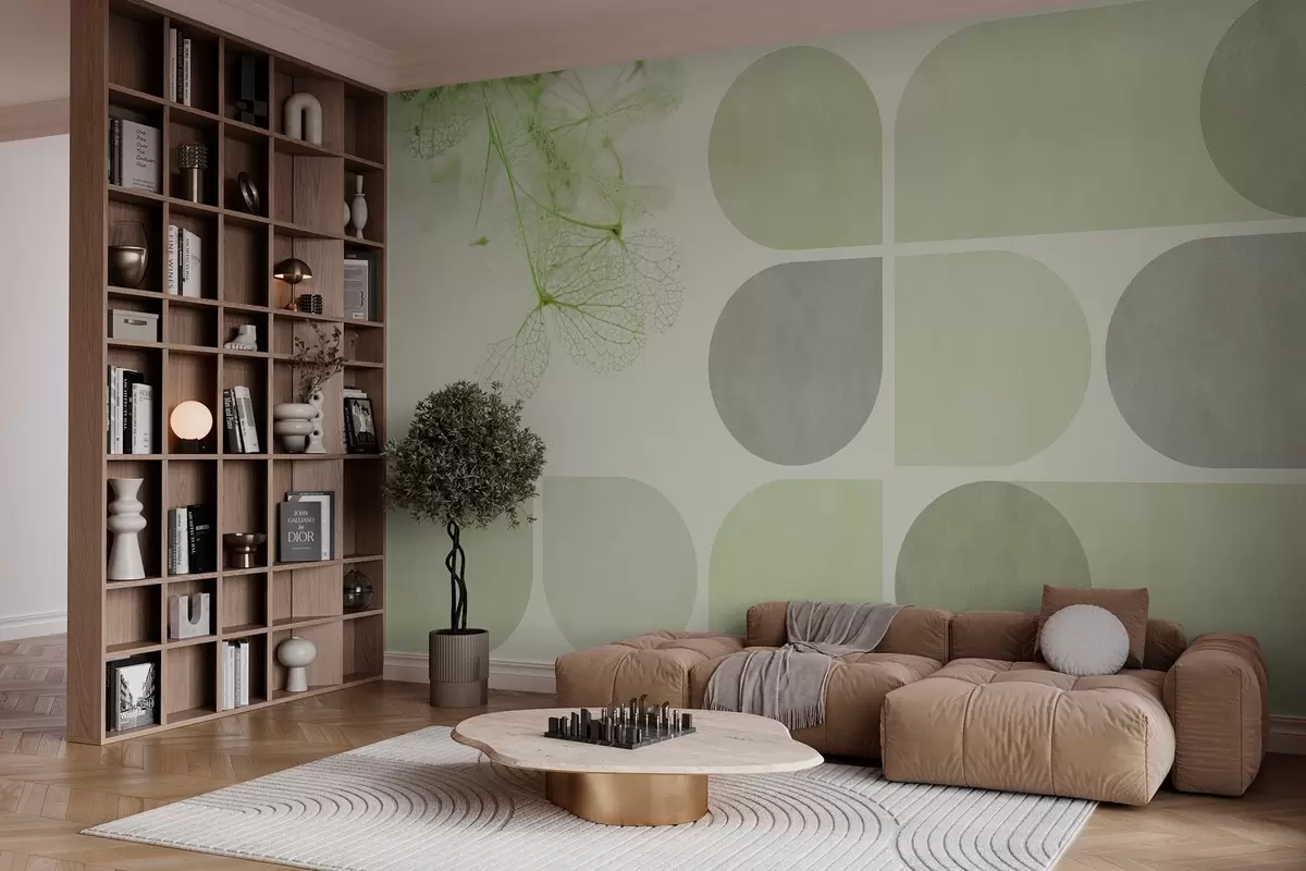 Carta da parati geometria e fiori secchi con venature nei toni del verde nr. w03617v1