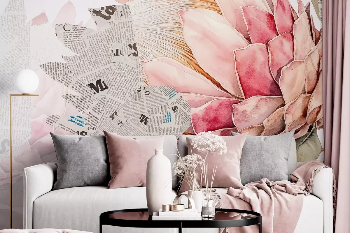 Carta da parati Fiori di protea, arte del giornale, floreale, tropicale, colori naturali nr. w03667