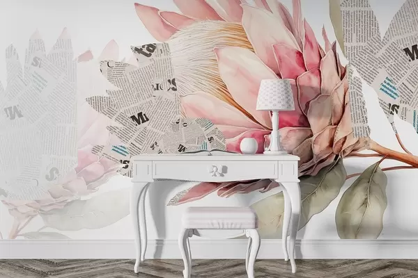 Carta da parati Fiori di protea, arte del giornale, floreale, tropicale, colori naturali nr. w03667