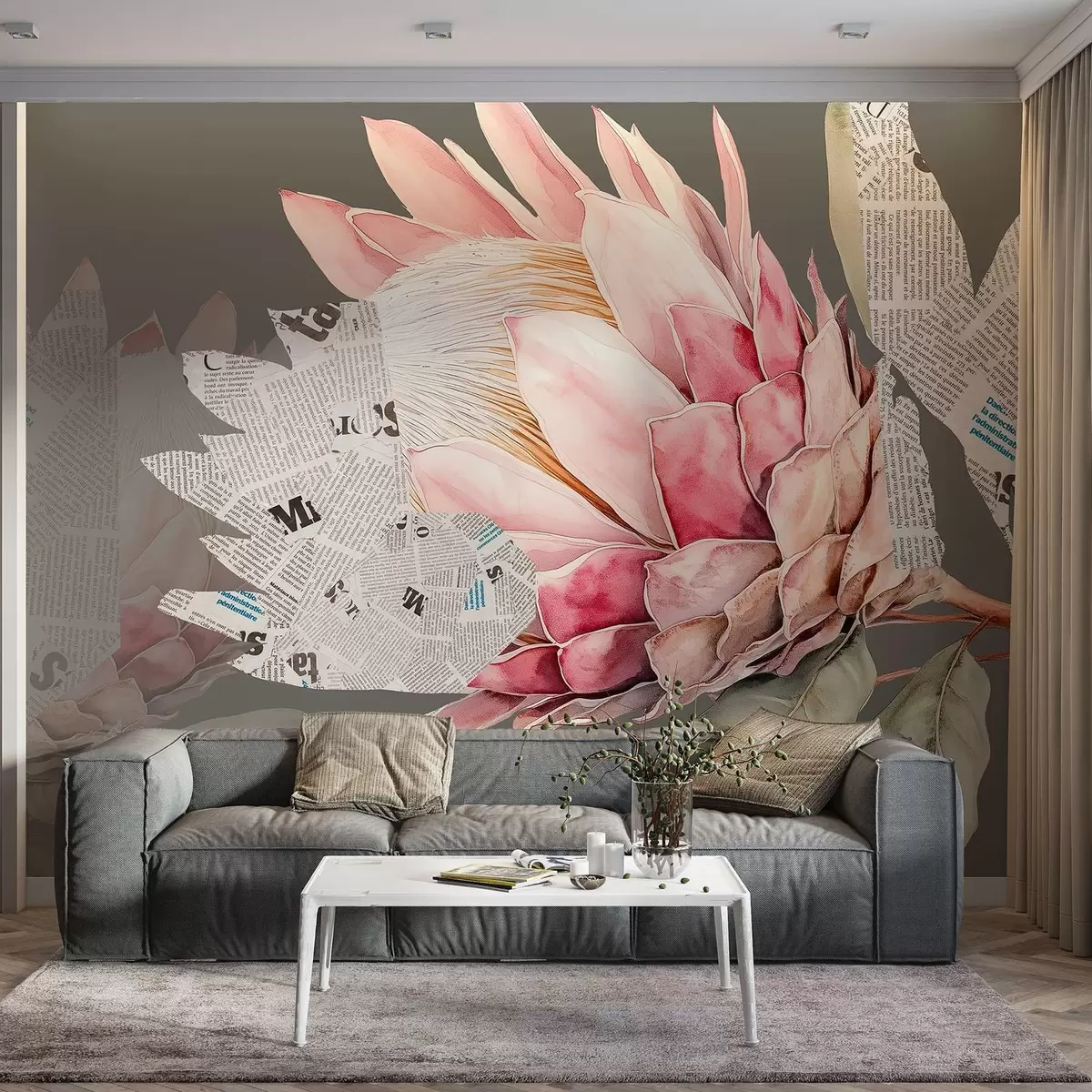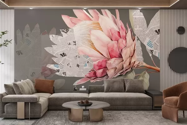 Carta da parati Fiori di protea, arte del giornale, floreale, tropicale, sfondo verde nr. w03667v1