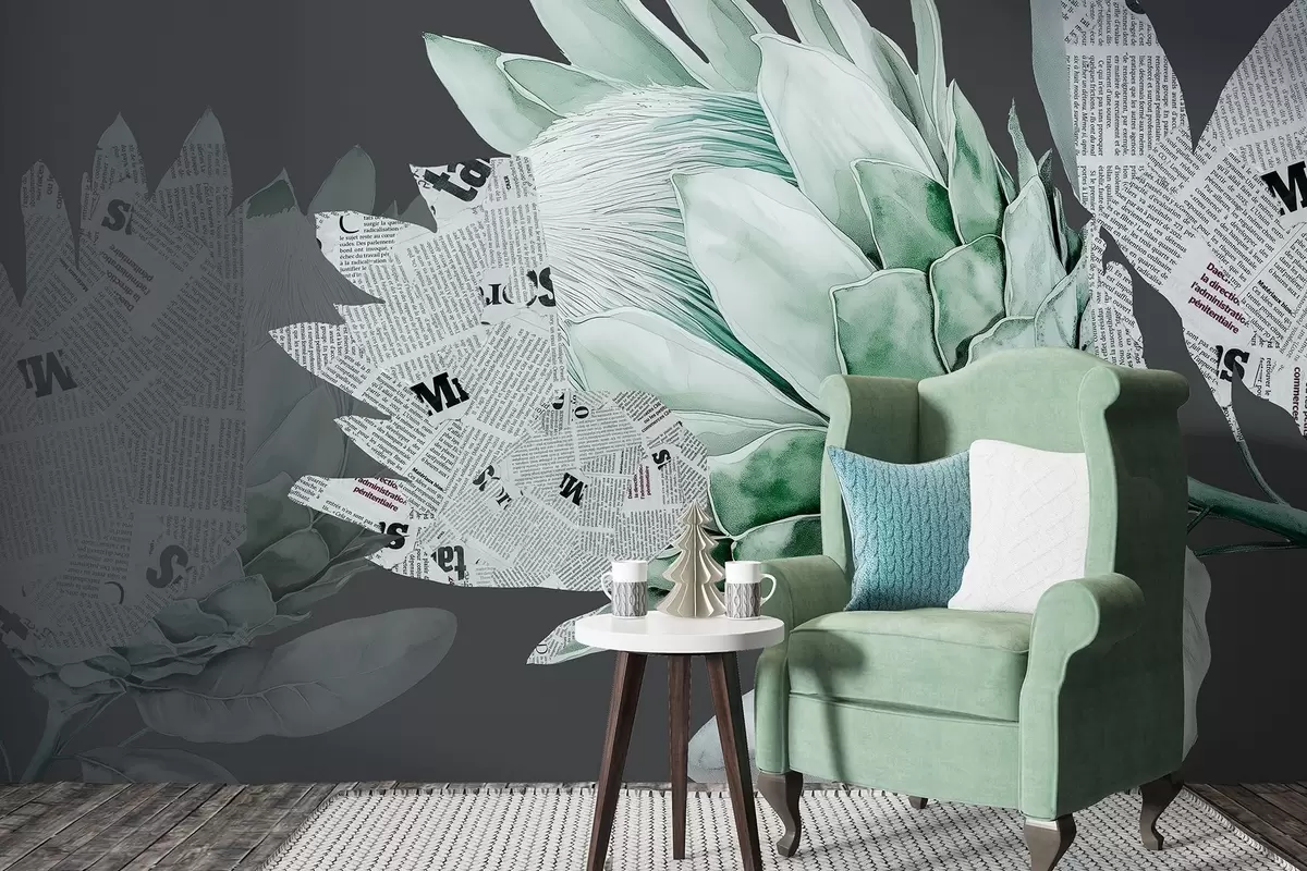 Carta da parati Fiori di protea, arte del giornale, floreale, tropicale, sfondo scuro, colori verdi nr. w03667v3