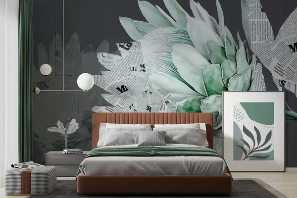 Carta da parati Fiori di protea, arte del giornale, floreale, tropicale, sfondo scuro, colori verdi nr. w03667v3