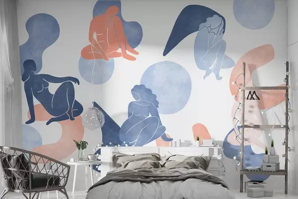 carta da parati Astrazioni geometriche con silhouette femminili, stile boho, blu, beige, rosa nr. w03753v1