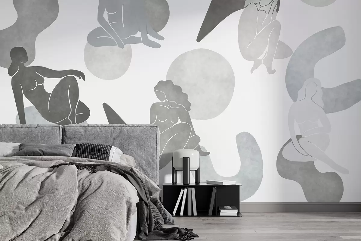 Carta da parati Astrazioni geometriche con silhouette femminili, stile boho, colori grigi nr. w03753v5