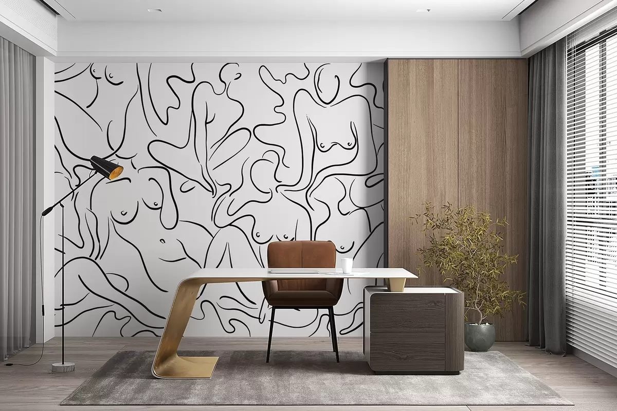 Carta da parati Disegno lineare di silhouette di corpi femminili, astrazione, colore nero nr. w03755