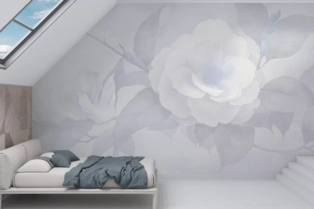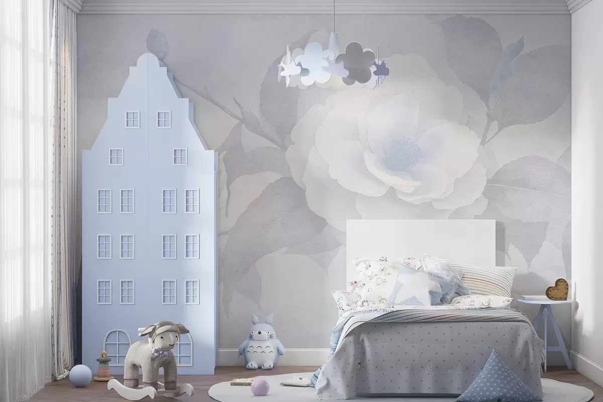 Carta da parati Morbido pastello con fiori di camelia sul ramo, colori blu nr. w03760v1