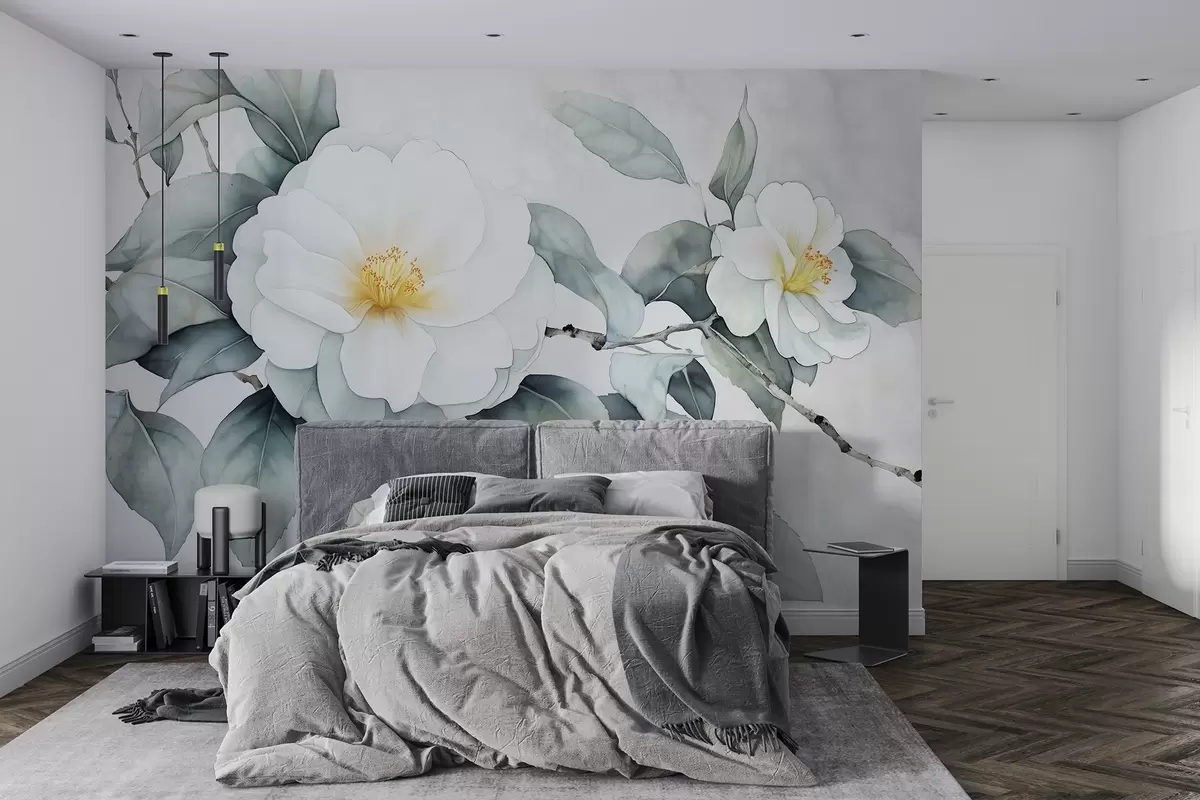 Carta da parati Fiori di camelia in stile acquerello sul ramo, colori naturali nr. w03761
