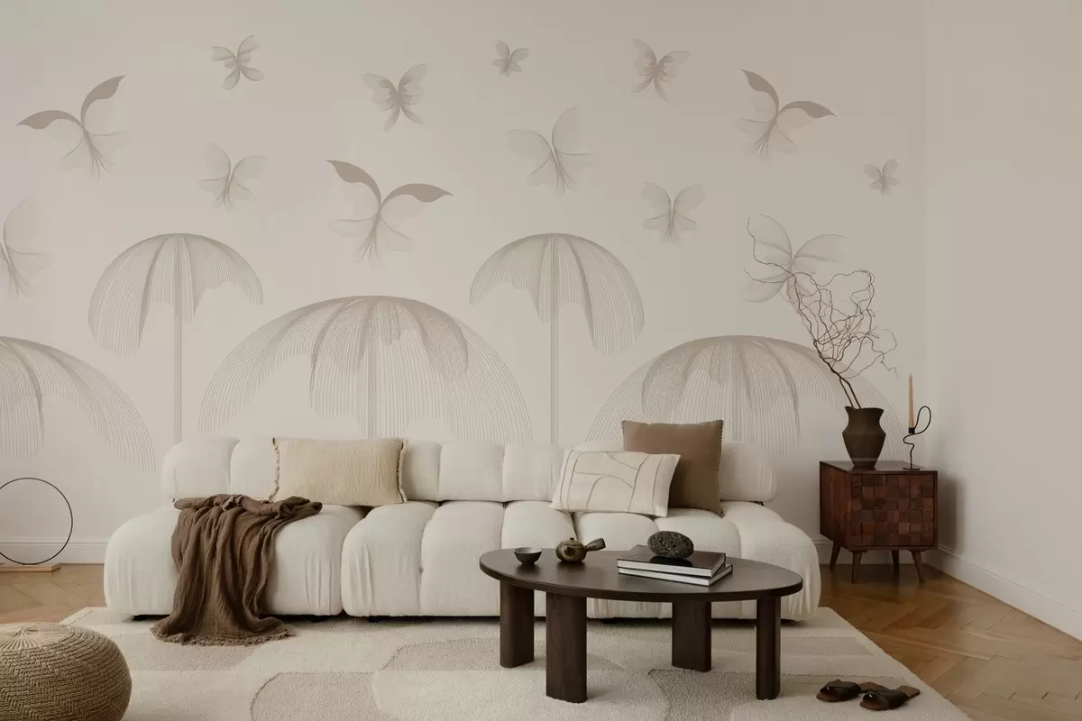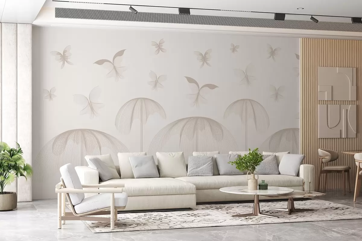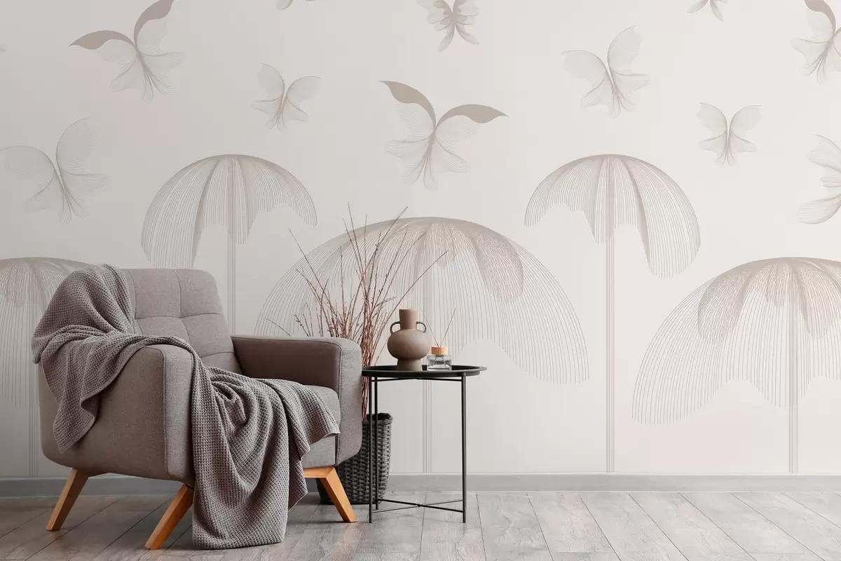 Carta da parati carta da parati lineare minimalista con farfalle e fontane su uno sfondo lattiginoso nr. w03762