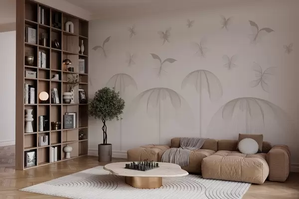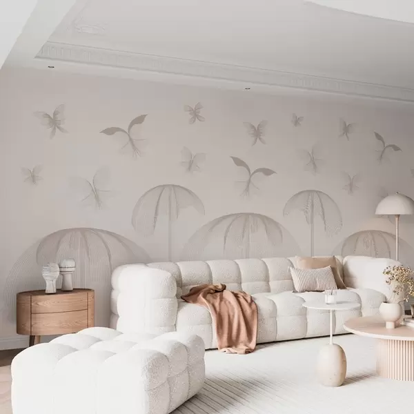 Carta da parati carta da parati lineare minimalista con farfalle e fontane su uno sfondo lattiginoso nr. w03762