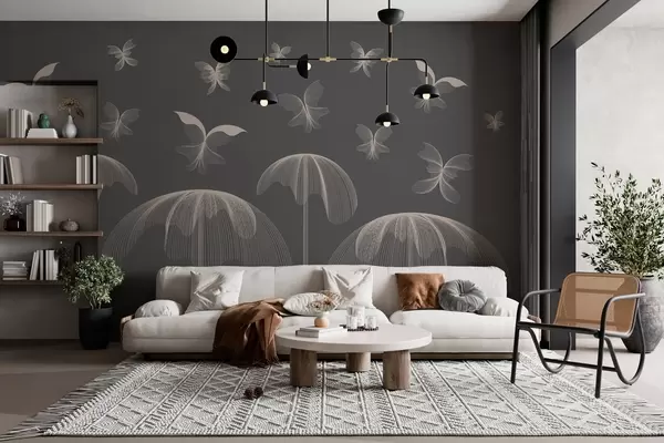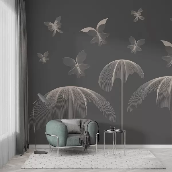 Carta da parati carta da parati lineare minimalista con farfalle e fontane su uno sfondo grigio scuro nr. w03762v1