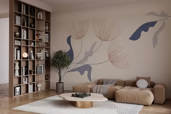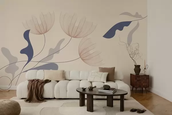Carta da parati eleganti fiori minimalisti nei toni del blu su sfondo beige nr. w03763
