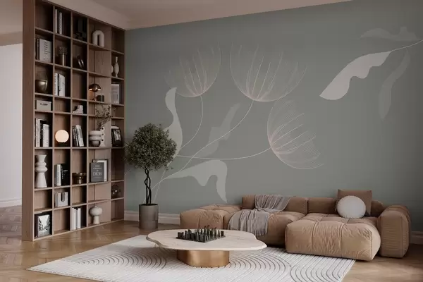 Carta da parati eleganti fiori minimalisti nei toni del verde su sfondo beige nr. w03763v2