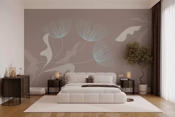 Carta da parati eleganti fiori minimalisti nei toni del bianco e del blu su sfondo moka nr. w03763v3