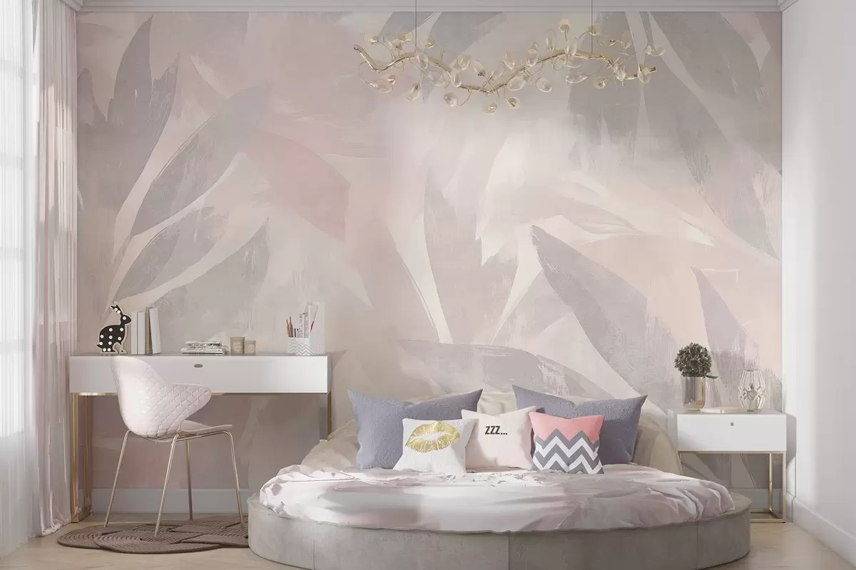 Carta da parati Foglie tropicali, fiori, palme, stile pastello, colori rosa e beige nr. w03881