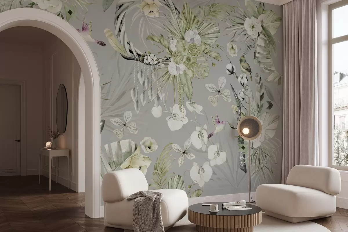 Carta da parati Ornamento in stile boho con fiori di peonia e uccelli, stile acquerello, colori verdi nr. w03885v2