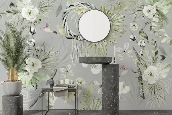 Carta da parati Ornamento in stile boho con fiori di peonia e uccelli, stile acquerello, colori verdi nr. w03885v2