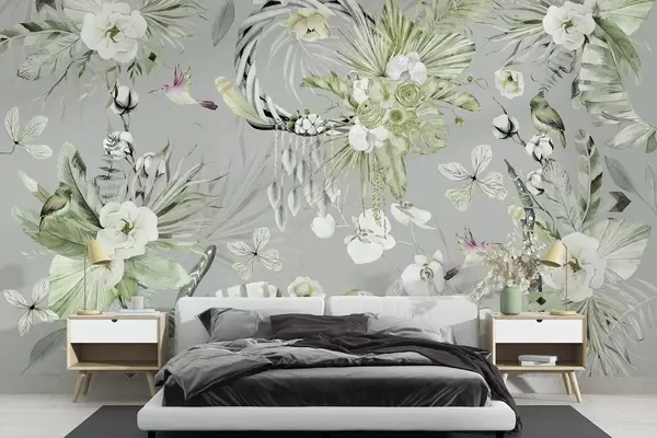 Carta da parati Ornamento in stile boho con fiori di peonia e uccelli, stile acquerello, colori verdi nr. w03885v2