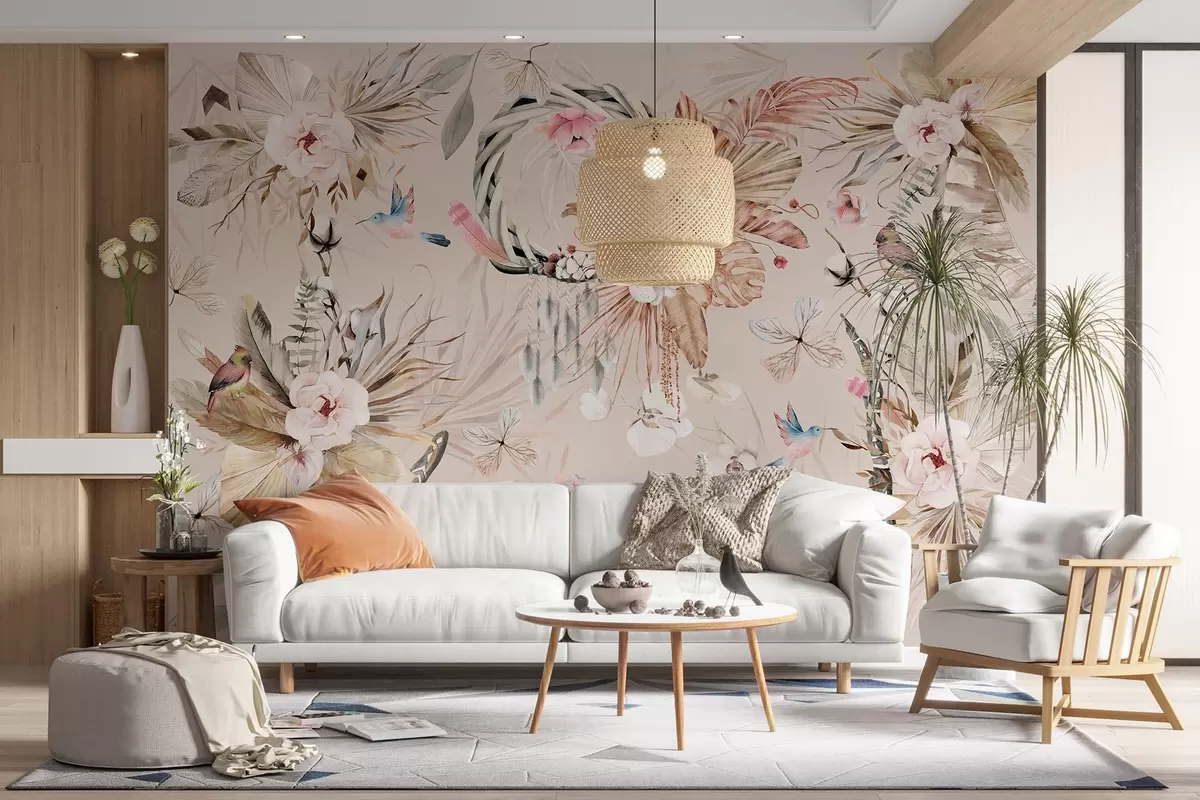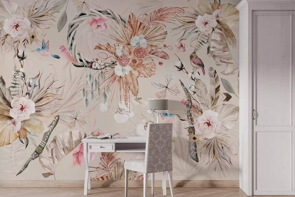 Carta da parati Ornamento in stile boho con fiori di peonia e uccelli, stile acquerello, colori tenui nr. w03885v3