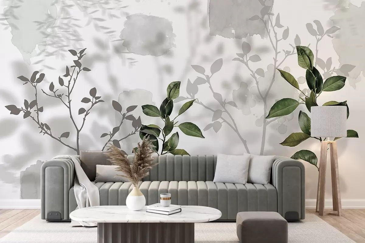 Carta da parati Foglie di limone, ombre di rami d'albero, natura, acquerello, verde nr. w03910v1