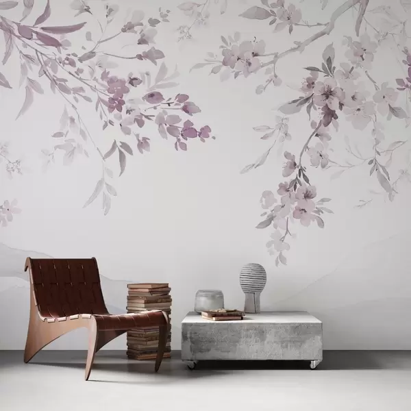 Carta da parati Rami fioriti, imitazione dell'acquerello, tonalità rosa-viola nr. w03935v1