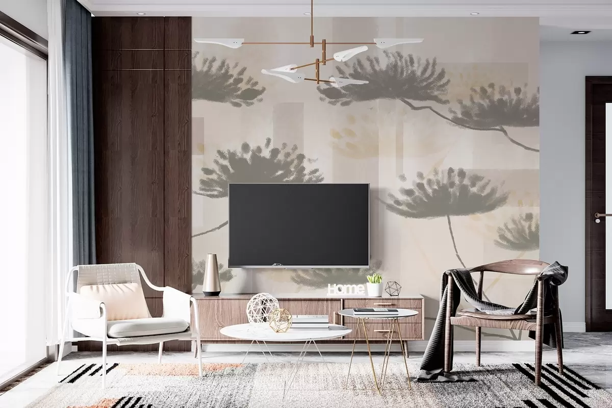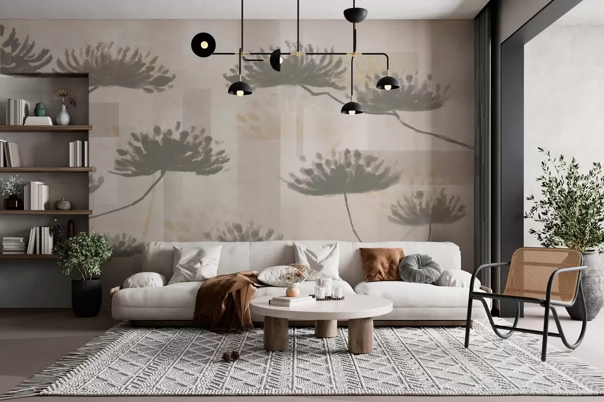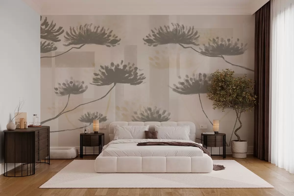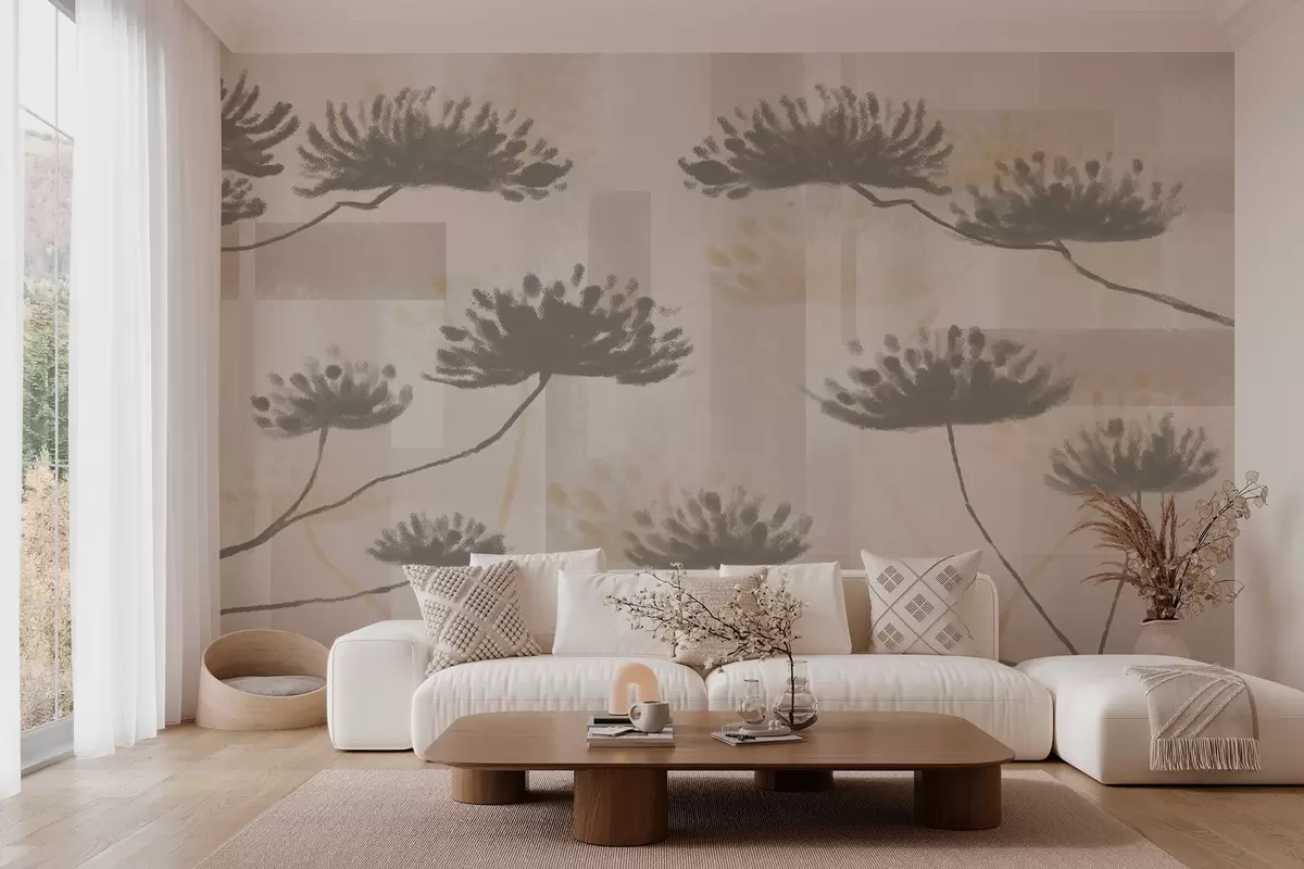 Carta da parati geometria strutturata nei toni del beige e del crema con fiori stilizzati a ombrello nr. w03960