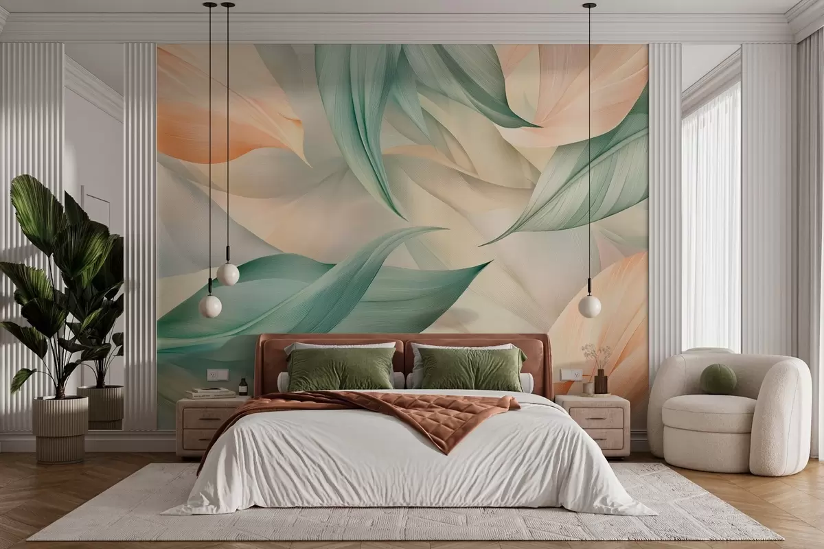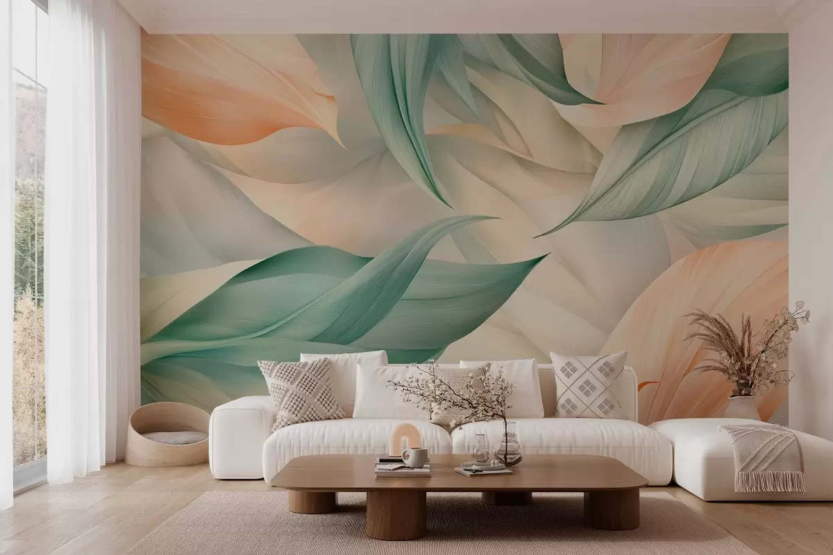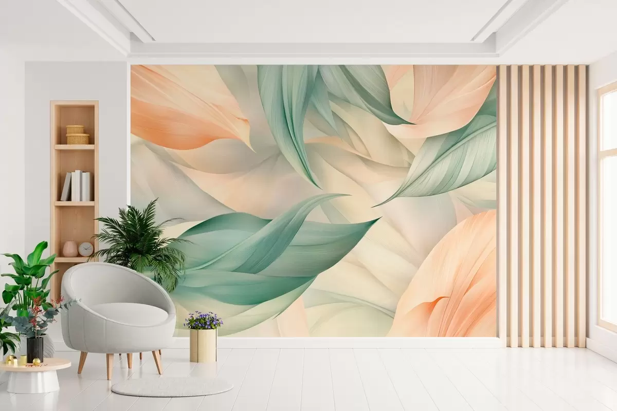 Carta da parati foglie esotiche tropicali nelle delicate tonalità del verde e del pesca nr. w03962