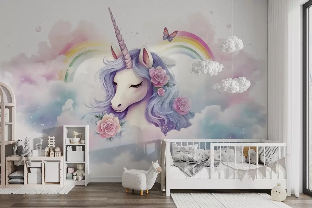 Carta da parati Unicorno pastello tra le nuvole con arcobaleno e rose nr. w03990