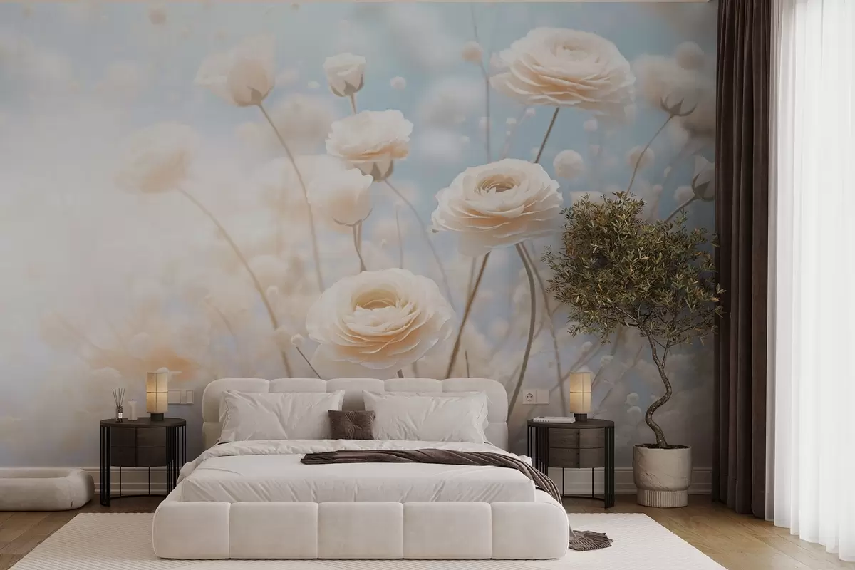 Carta da parati Delicate rose color crema su sfondo azzurro nr. w03997
