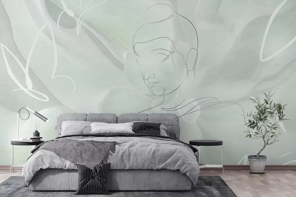 Carta da parati Astrazione floreale con disegno a linee di Buddha, colori verdi nr. w04004v3