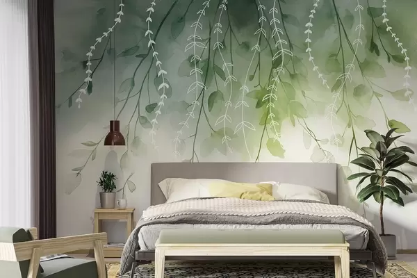 Carta da parati Rami con foglie in stile acquerello, colori verdi naturali nr. w04007