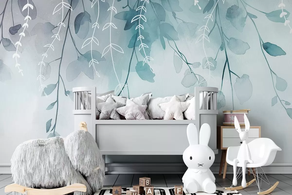 Carta da parati Rami con foglie in stile acquerello, colori naturali acquamarina nr. w04007v3