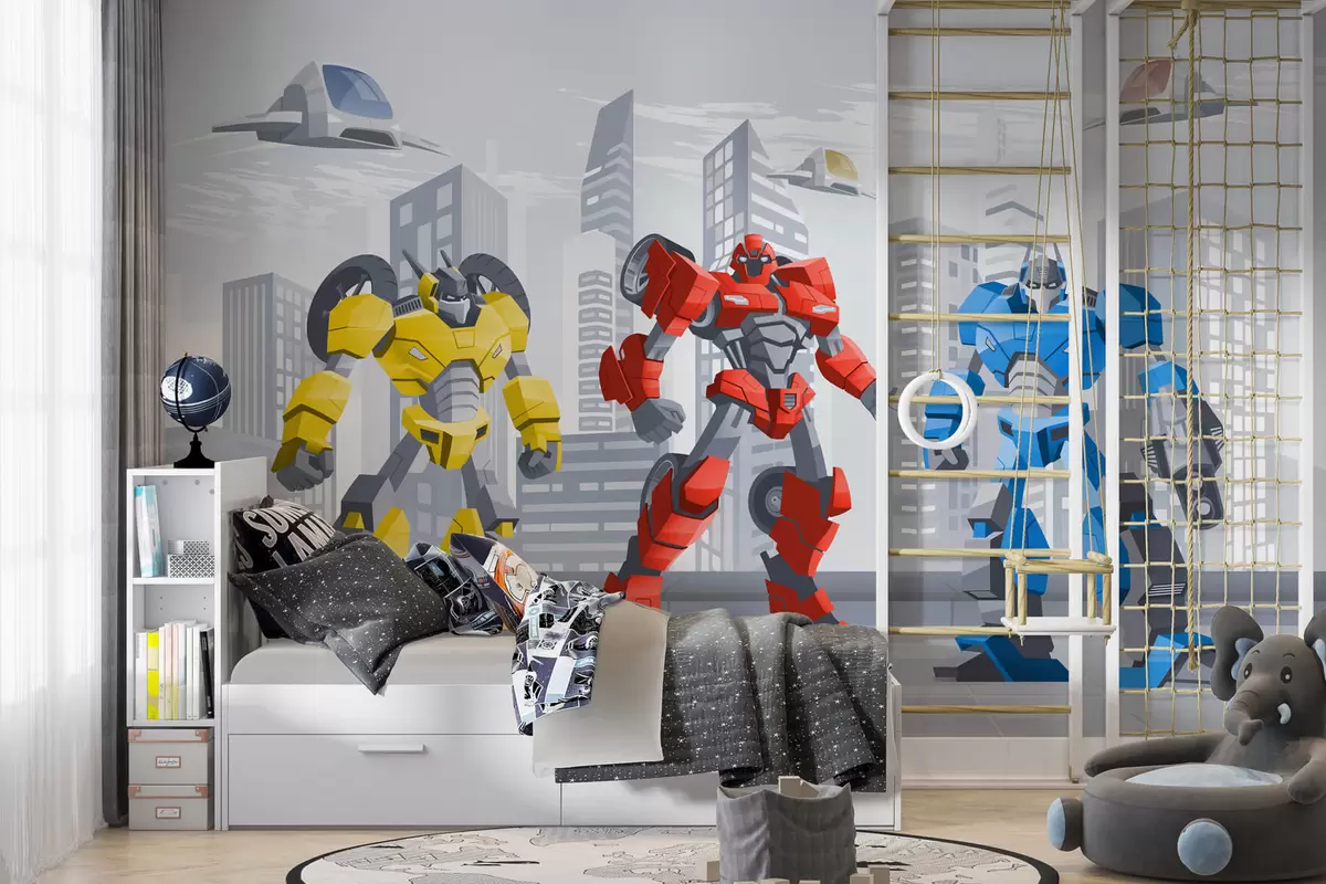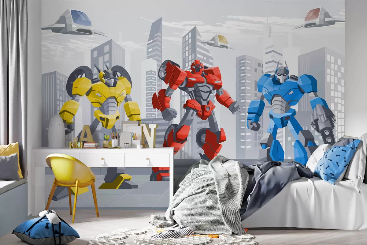 Carta da parati Robot trasformisti sullo sfondo di una città monocromatica nr. w04012