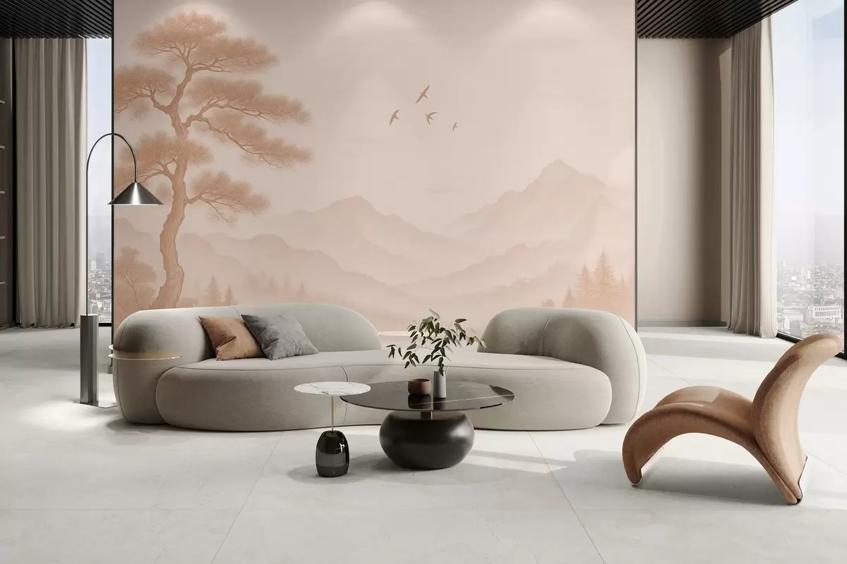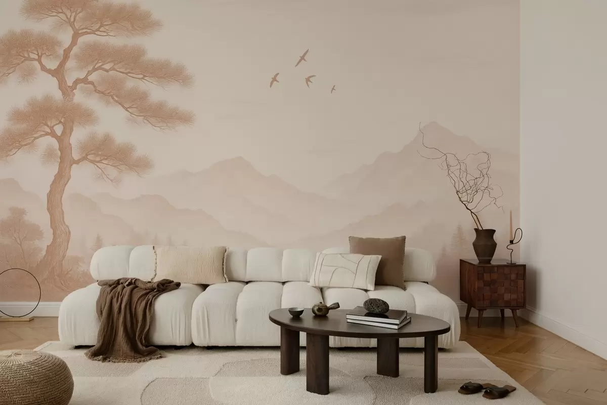Carta da parati panorama di colline con un grande albero in tonalità moka nr. w04033v1