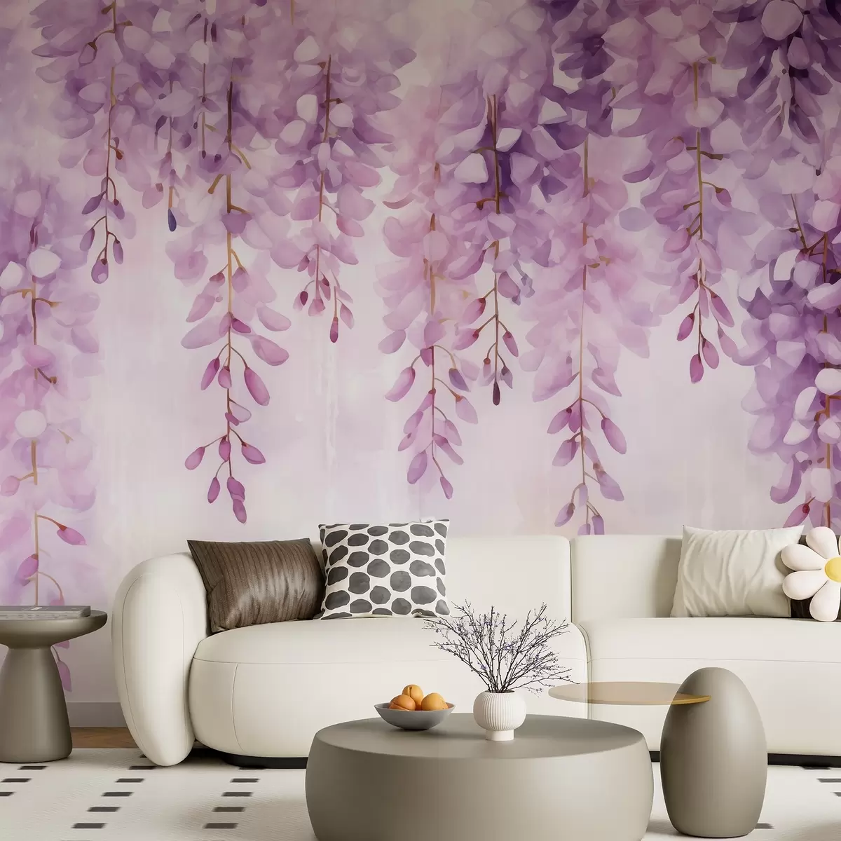 Carta da parati Delicata composizione ad acquerello con glicine a cascata nei toni tenui della lavanda e del rosa, che crea un'atmosfera pacifica, nr. w04034