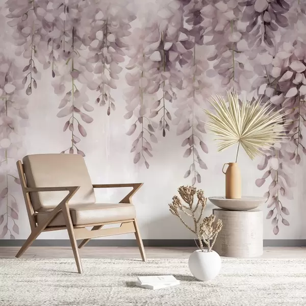 Carta da parati Morbida scena acquerellata nei toni del rosa crema, con grappoli di glicine a cascata che formano una sognante tenda floreale nr. w04034v2