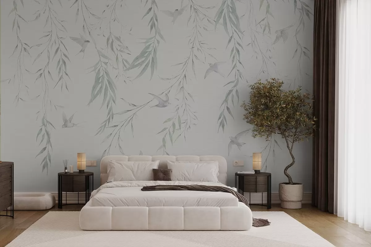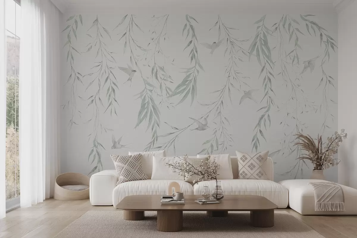 Carta da parati Ramoscelli con foglie verdi appese e uccelli nr. w04052