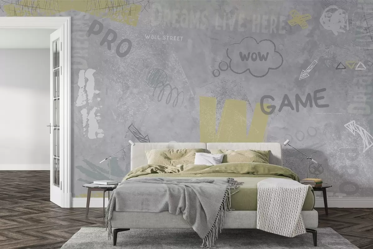 Carta da parati Design in stile street art con scritte di colore giallo su sfondo di muro di cemento nr. w04056