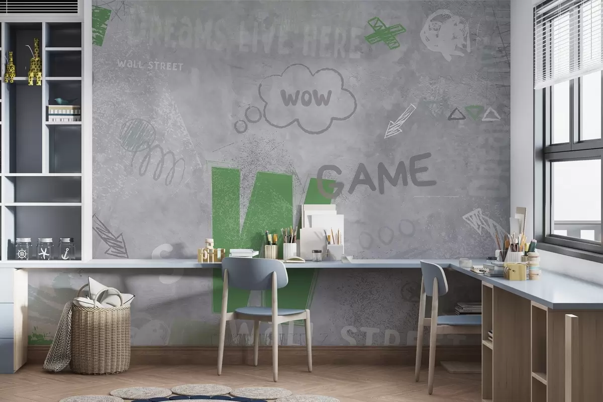 Carta da parati Disegno di street art con scritte di colore verde su sfondo di muro di cemento nr. w04056v2