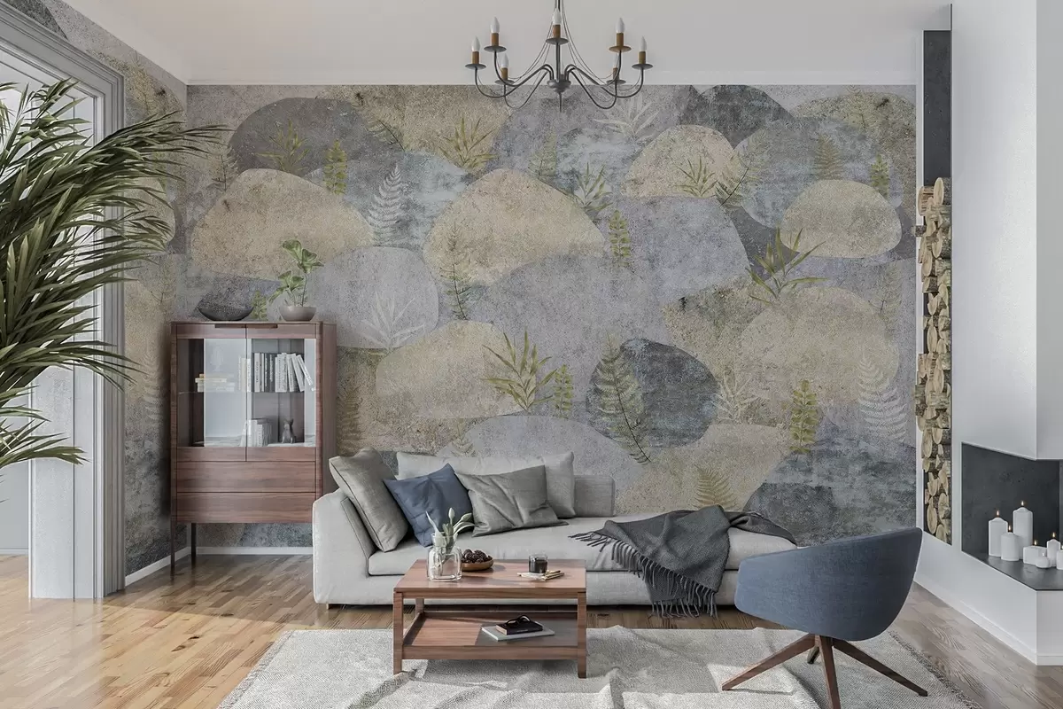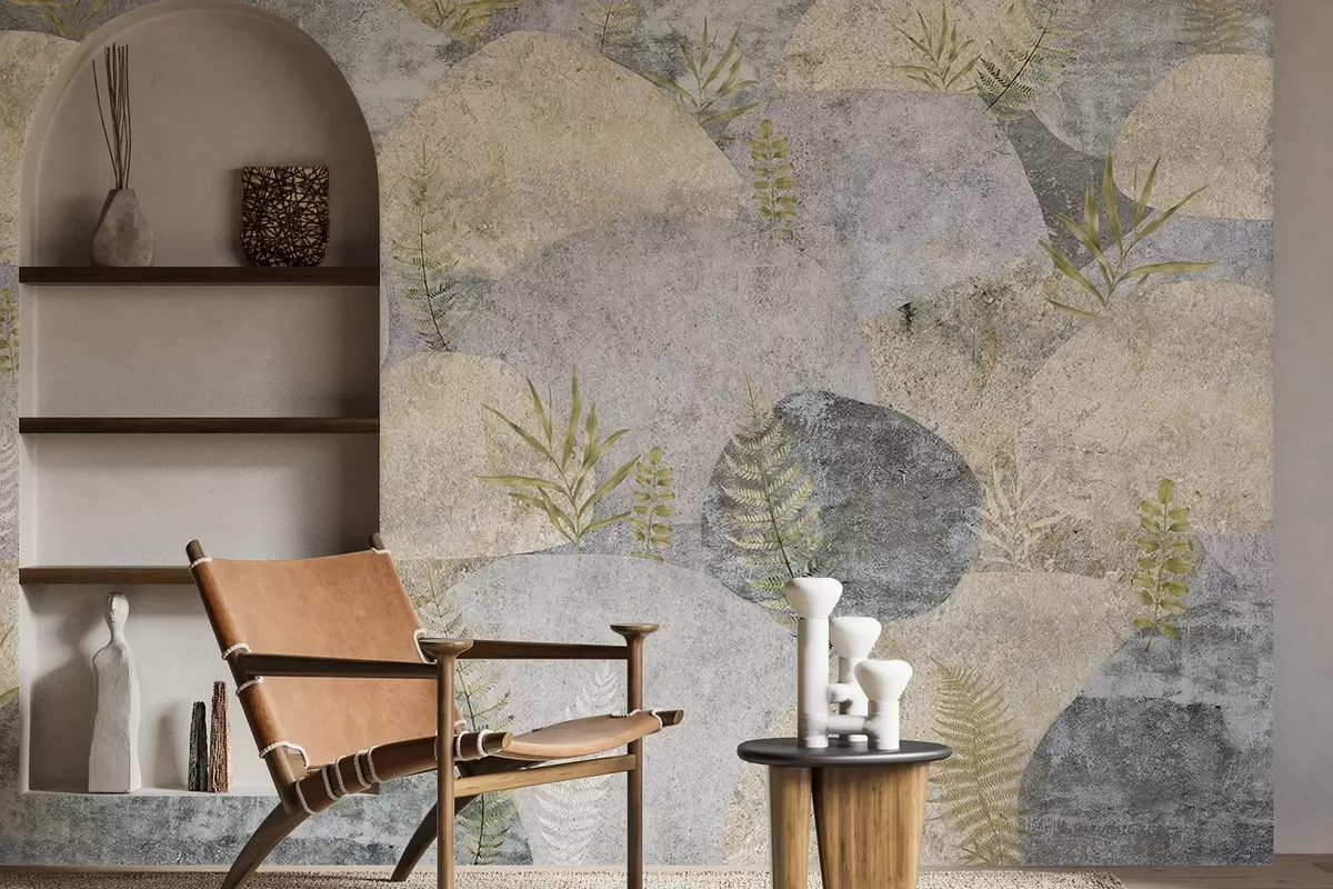 Carta da parati Pietre con piante, felce, stile nordico, rustico, colori grigio e sabbia nr. w04064