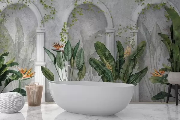 Carta da parati Parete in cemento con archi e piante tropicali, floreali, dai colori naturali nr. w04065