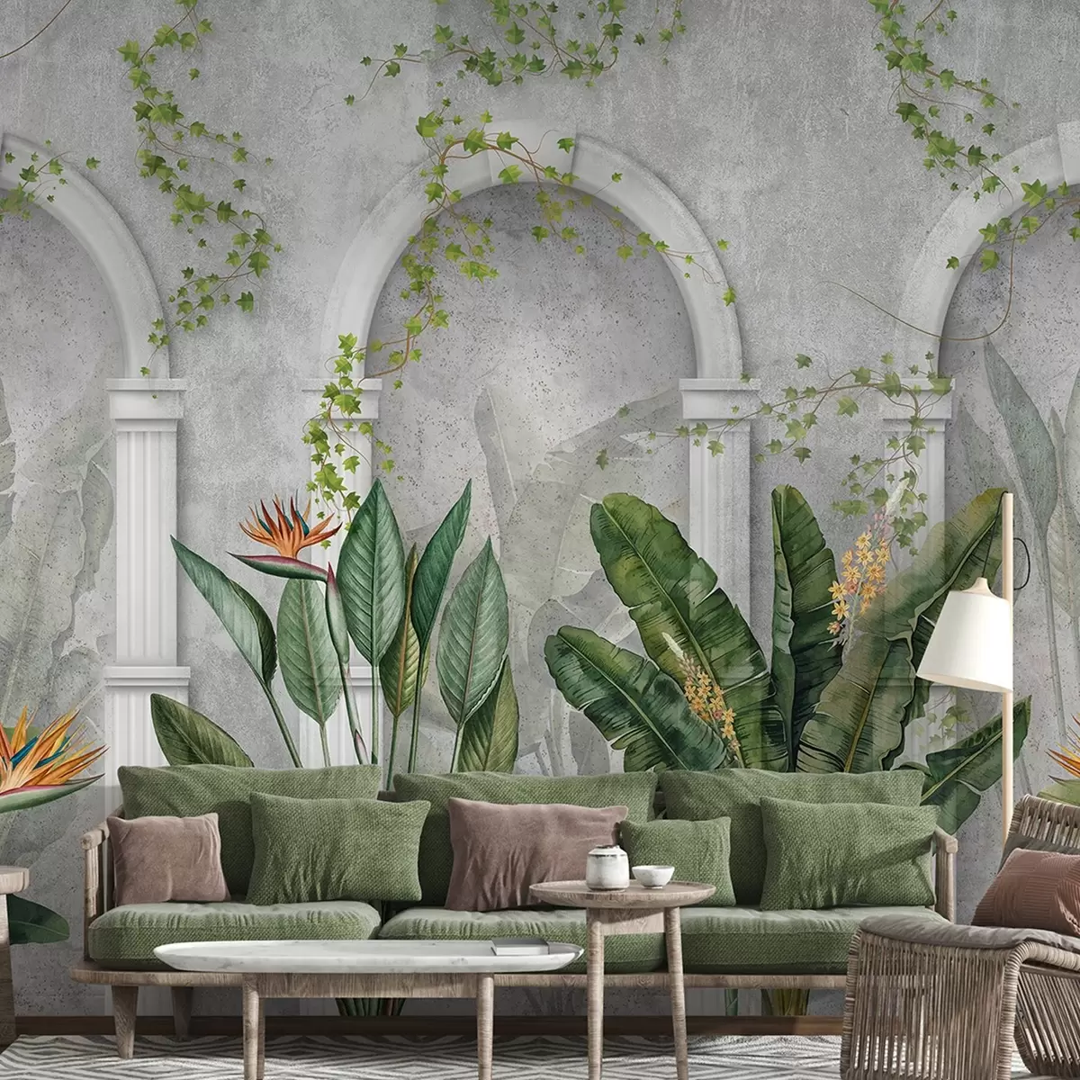 Carta da parati Parete in cemento con archi e piante tropicali, floreali, dai colori naturali nr. w04065