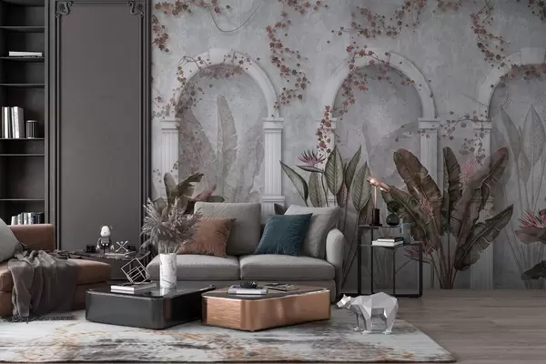 Carta da parati Parete in cemento con archi e piante tropicali, floreali, colori bordeaux nr. w04065v1