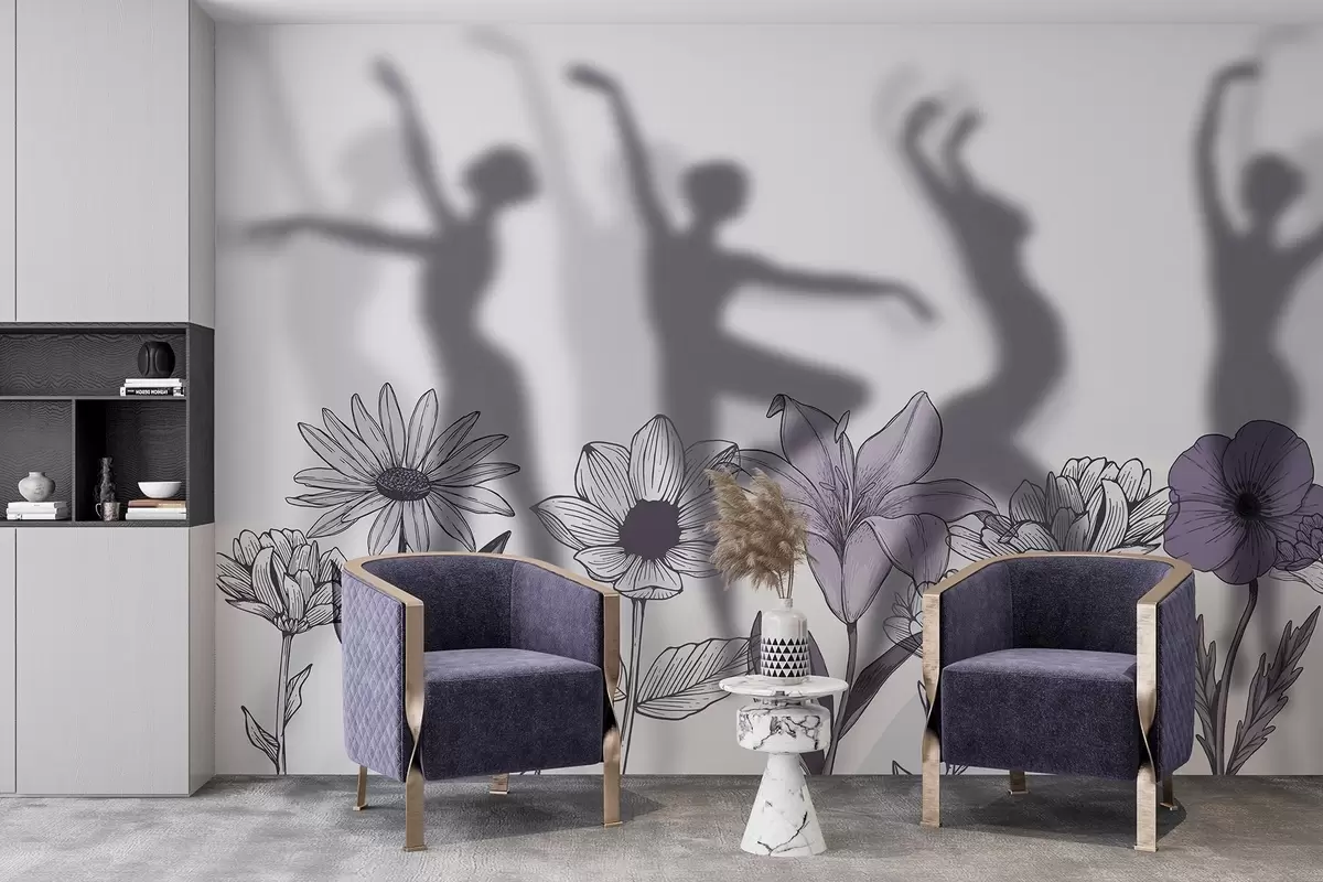 Carta da parati Silhouette di ballerine, fiori rustici, line art, colori grigio e viola nr. w04069v2