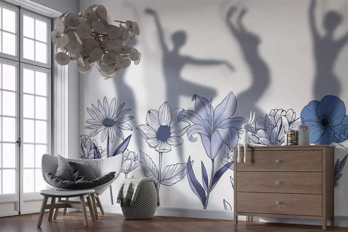 Carta da parati Sagome di ballerine, fiori rustici, line art, colori blu nr. w04069v3