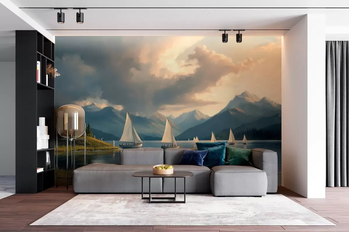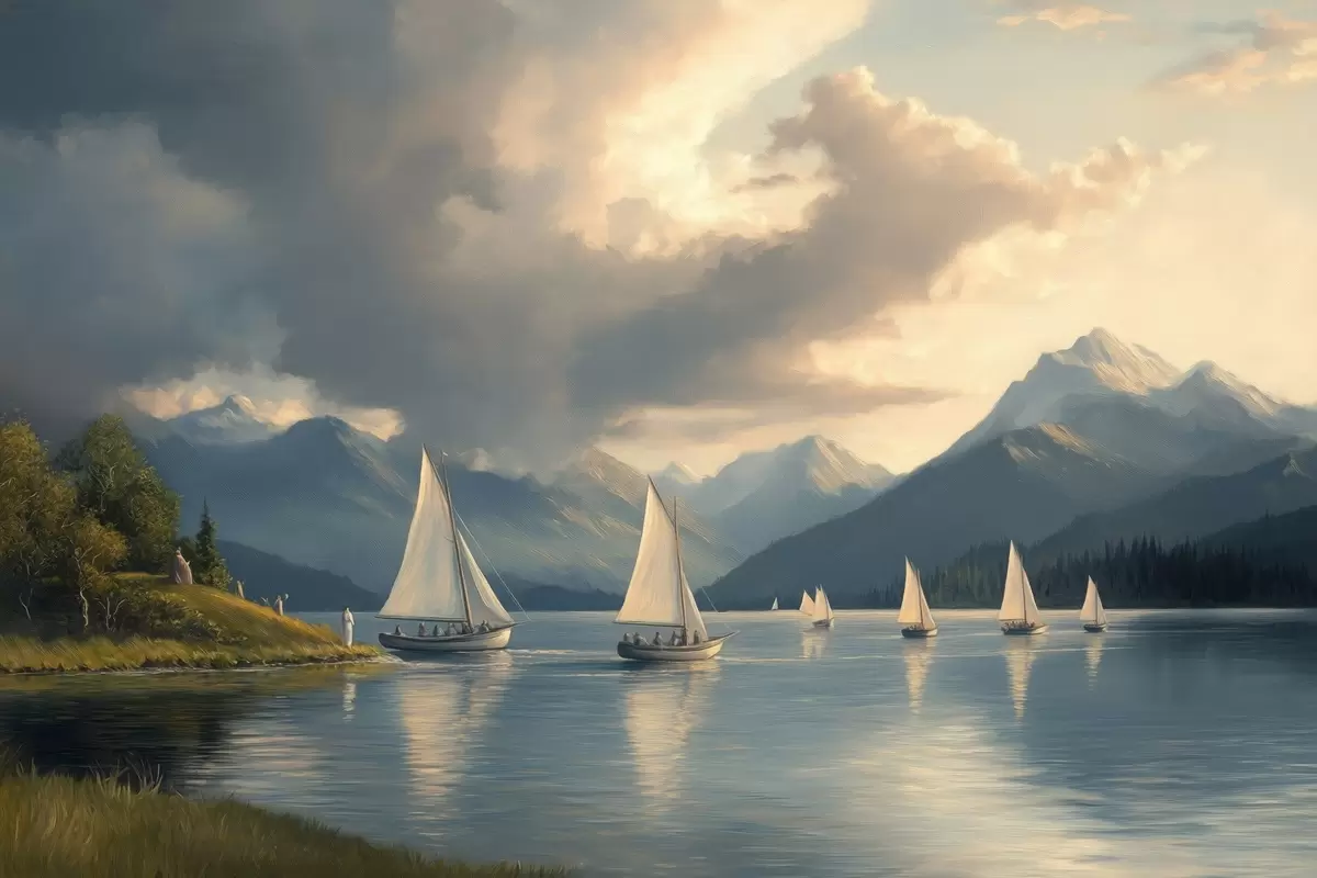 Carta da parati regata su un lago con cielo nuvoloso nello stile di un dipinto a olio del XIX secolo nr. w04076