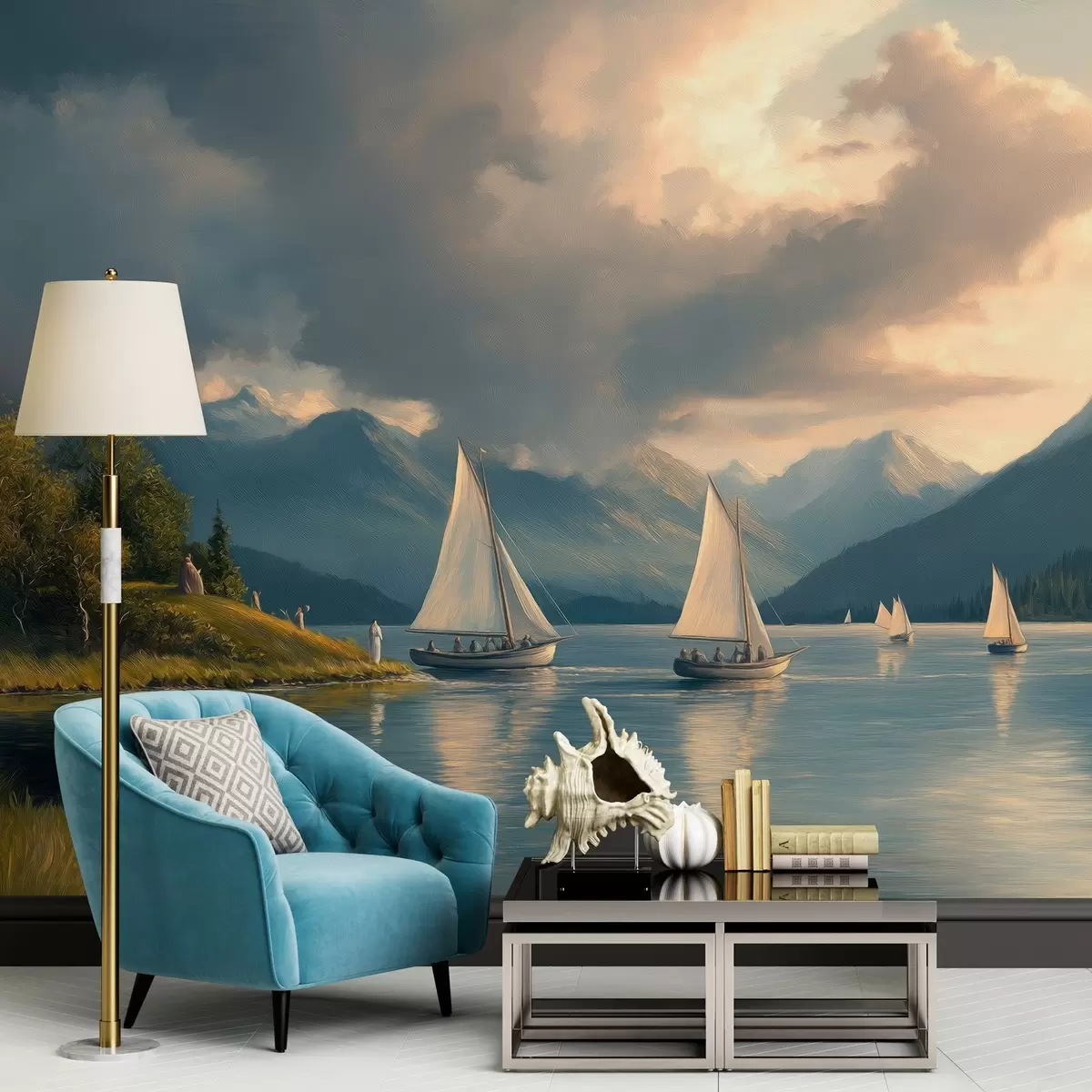Carta da parati regata su un lago con cielo nuvoloso nello stile di un dipinto a olio del XIX secolo nr. w04076