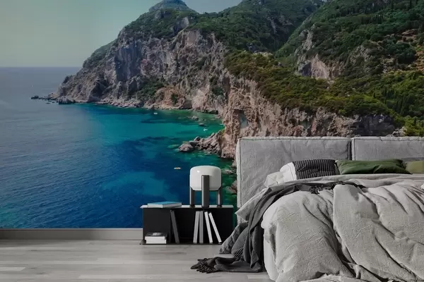 Carta da parati Montagne rocciose vicino al mare, disegno ad olio, acqua acquamarina nr. w04096