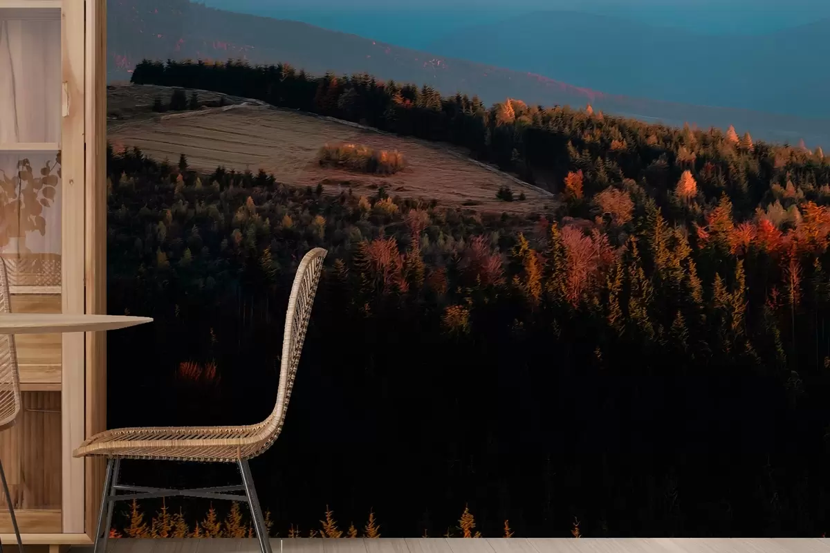 Carta da parati Montagne dei Carpazi, texture stile olio, foresta autunnale, cielo al tramonto nr. w04098